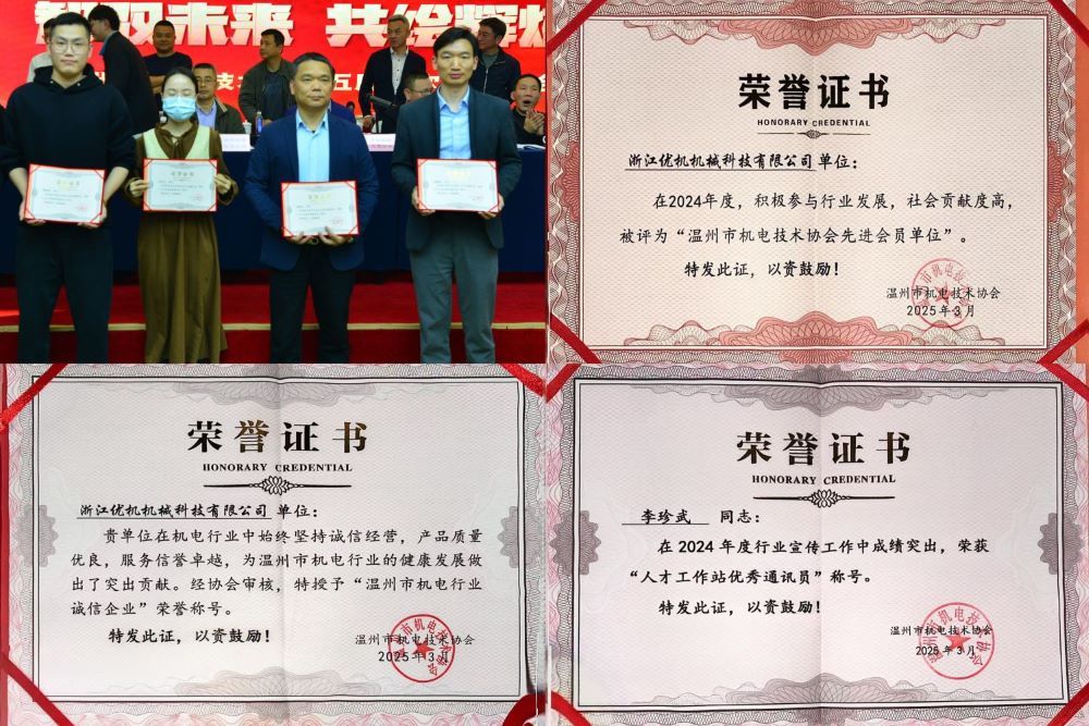3月26日,在溫州市機電技術協(xié)會五屆三次會員大會上,浙江優(yōu)機機械科技有限公司憑借卓越表現(xiàn),榮獲2024年度"溫州市機電行業(yè)誠信企業(yè)"和"溫州市機電技術協(xié)會先進單位"兩項榮譽稱號。公司總經(jīng)理李珍武同時獲評"機電協(xié)會人才工作站優(yōu)秀通訊員"稱號。